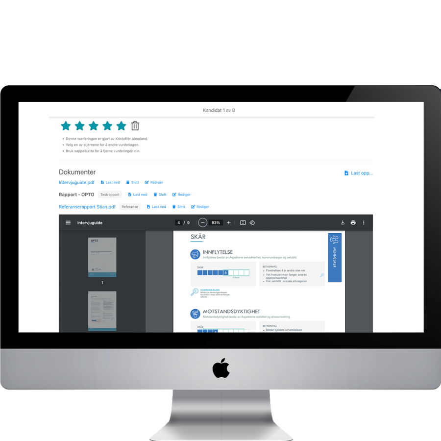 Resultatene integreres direkte i vår plattform og evaluerer kandidatene automatisk mot stillingens kriterier, slik at de beste kandidatene identifiseres raskt og nøyaktig.